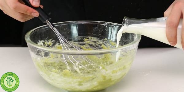 Bước 3: Cho bơ và sữa vào hỗn hợp. Khuấy nhẹ nhàng, tránh làm cho bột bị vón cục. Trộn đều hỗn hợp đến khi bột trở nên mịn thì dừng lại.