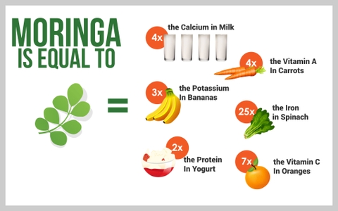Lá tươi là nguồn cung cấp vitamin A tốt, có chức năng quan trọng trong viêc sinh sản, tăng trưởng và phát triển phôi,tăng khả năng miễn dịch và nhìn ra sự khác biệt tế bào. Lá chùm ngây là nguồn cung cấp carotenoids tốt với tiềm năng pro-vitamin A.
